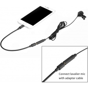El producto consta de 2 partes, un cable adaptador macho de 3.5mm TRS a lightning y un micrófono de solapa con conector hembra de 3.5mm.