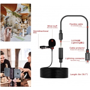 – Conector Lightning certificado por Apple MFi el cual permite conectar otros micrófonos a un teléfono Iphone, por ejemplo el Boya By-BM3011, o el clásico Boya BY-MM1